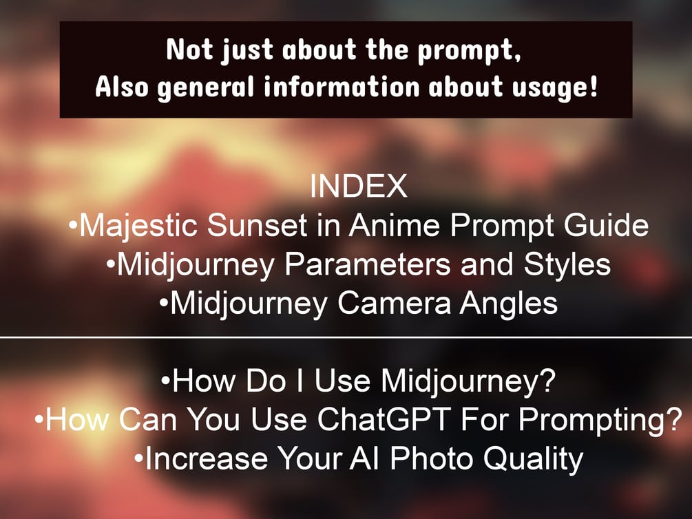 •»Majestic Sunset In Anime Prompt Guide, •»Midjourney Parameters and Styles, •» Midjourney Camera Angles, •» How Do I Use Midjourney?, •» How Can You Use ChatGPT For Prompting?, •» Increase Your AI Photo Quality